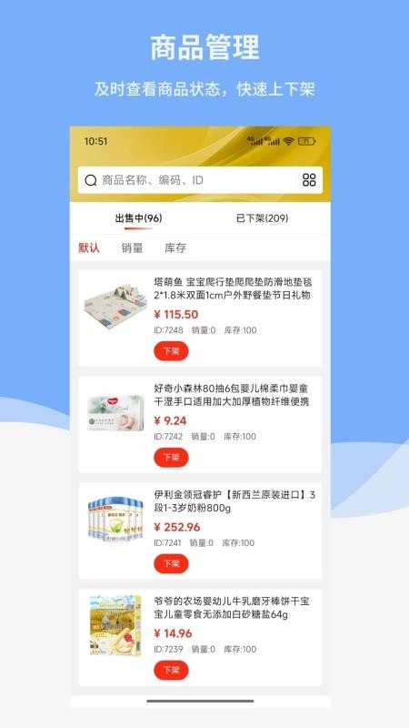 1、用户在软件中能够对商品进行上下架管理,并随时查看商品的状态信息。