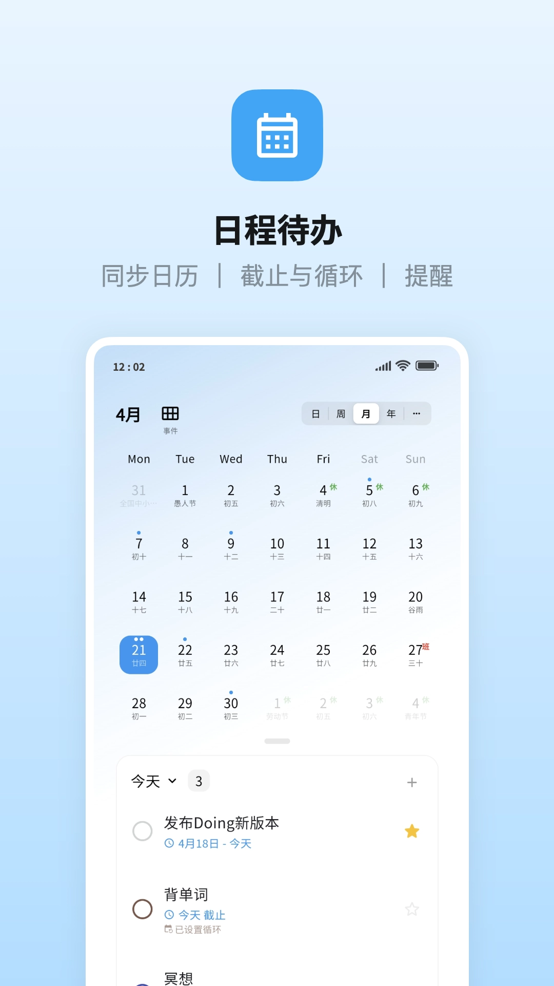 Doing是一款功能强大的时间管理应用程序,它能够助力你高效地规划生活、工作以及学习。该应用融合了番茄工作法和待办清单等实用功能,让你在专注于工作和学习的同时,还能有条不紊地管理各项任务。其专注模式搭配丰富的音效,有助于你提升效率,而数据统计分析功能则能帮你清晰了解时间的利用状况。此外,多端同步功能使数据无论何时何地都可使用,堪称提升生产力的得力帮手。