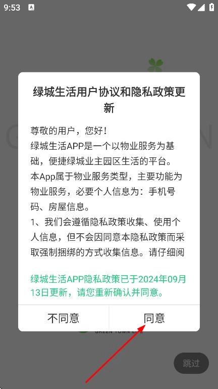 1. 于绿城生活用户协议与隐私政策更新弹窗里,点击同意,即可进入软件主界面。