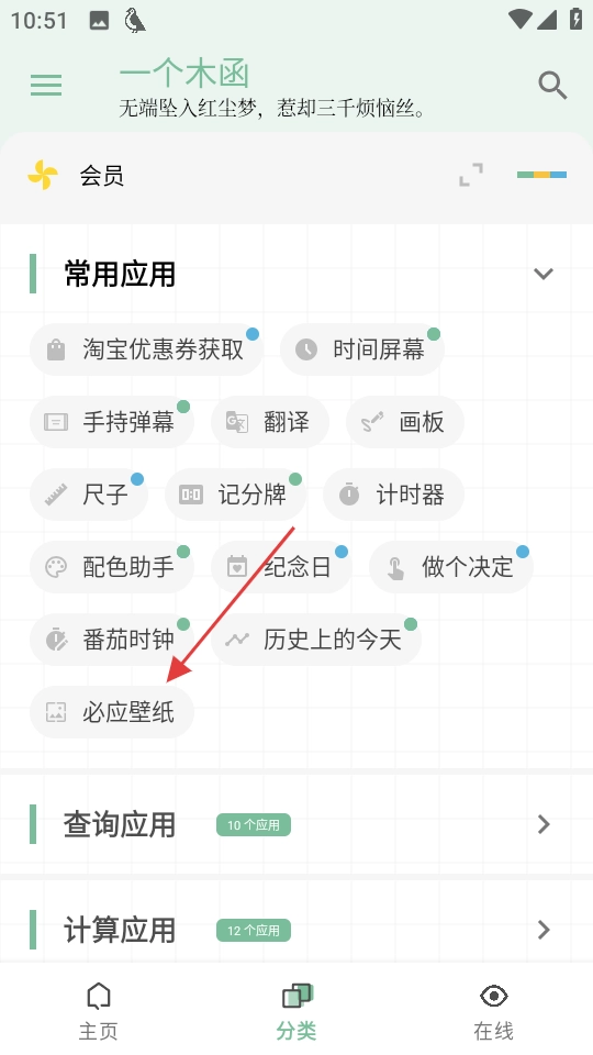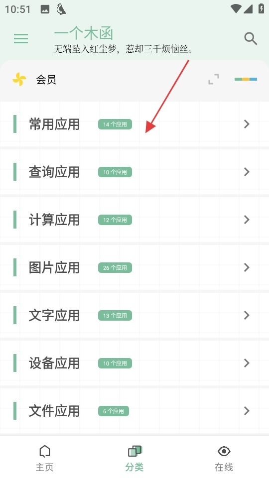 1. 于一个木函的分类页面处,点击“常用应用”,使常用应用列表展开。