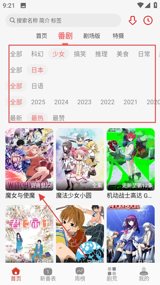 2. 在番剧筛选界面,依据想看的条件进行筛选,找出《魔女与使魔》,随后进入该剧集的页面。