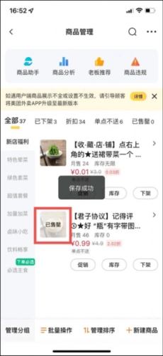 4、点击完成后,会显示该商品已售完,这就意味着商品相当于下架了,顾客无法下单。