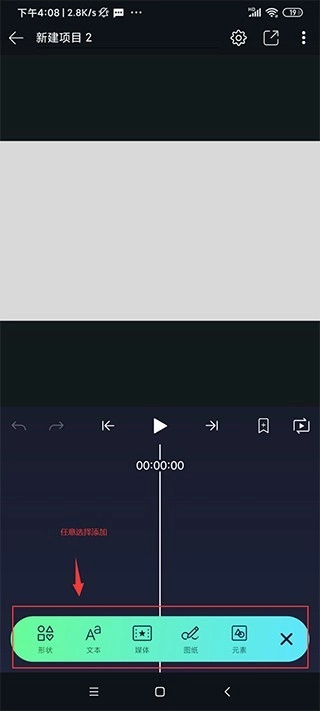 3、来到新项目编辑界面,再次点击加号,即可导入视频或者图片。
