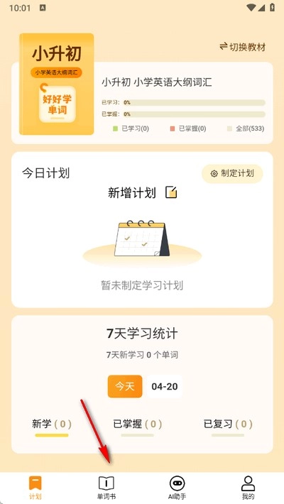 1. 打开好好学单词,进入软件首页,此时用户能够点击下方不同的功能板块来使用,点击【单词书】板块