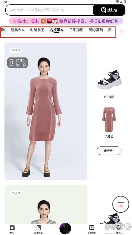 3、借助顶部的分类选项,浏览各类穿搭风格并挑选更多进行尝试。