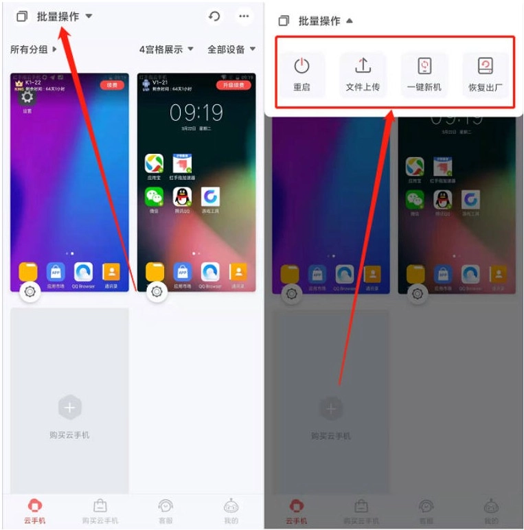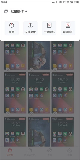 1. 进入红手指专业版安卓,点击主界面的批量操作按钮,呼出的云手机批量管理功能包括:批量重启、文件上传、一键新机、恢复出厂等操作。