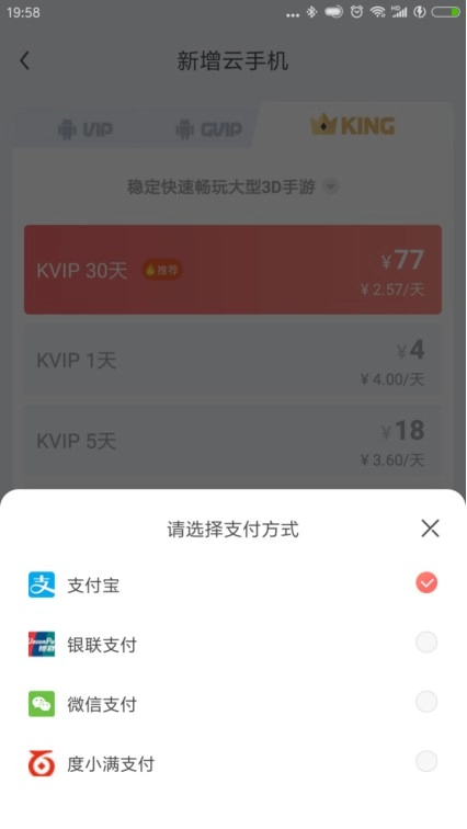 3. 升级差价由云手机剩余使用时长决定,选择支付方式,点击确认支付完成支付即可完成升级。