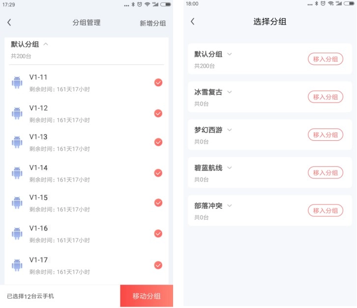 4. 勾选需要移动分组的云手机,点击移动分组可选择分组进行云手机的分组移动。