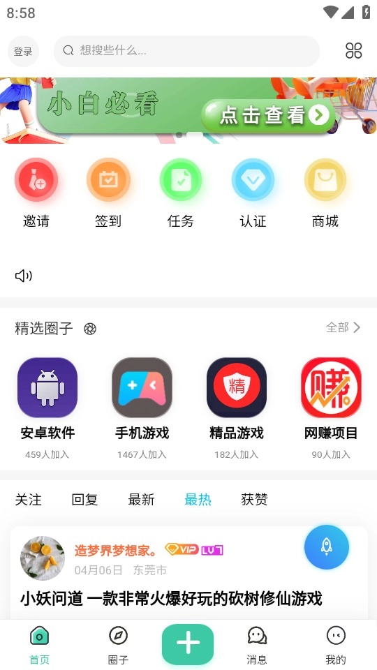 5、轻点下方的“+”号按钮,即可发布帖子。