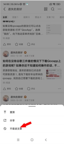 4、选择三点,点击“不看该文章”即可