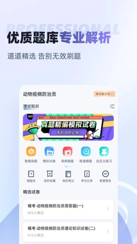 动物疫情防治员考试聚题库,堪称一款趣味十足且为考试必备的工具。在这里,朋友们能够运用其中的题库展开学习,还能进行错题纠正等操作,从而熟练掌握动物疫情防治员考试的知识内容。感兴趣的朋友们,快来使用这款软件吧!