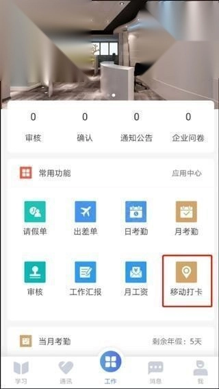2. 如果在常用功能里找不到【移动打卡】,请点击【应用中心】。