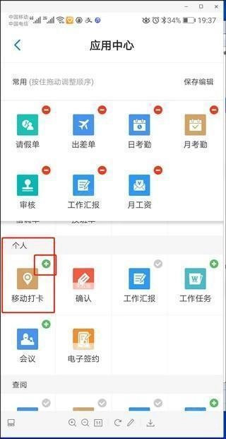 5、点击【移动打卡】右上角的“+”号,就能把移动打卡设为常用功能。