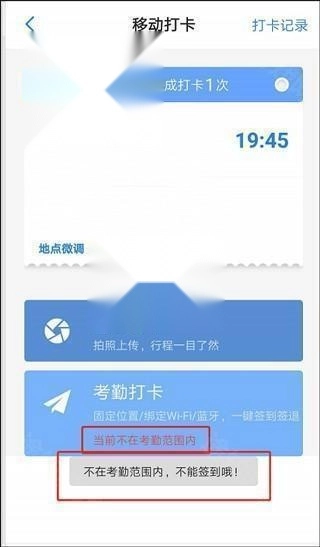 7、若不在考勤点范围内,将会显示“当前不在考勤范围内”,打卡显示为失败状态,无法进行签到操作。