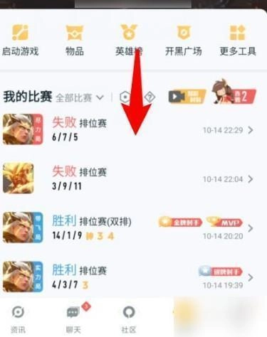 当进入战绩界面之后,向下滑动页面,从而找到常用英雄。