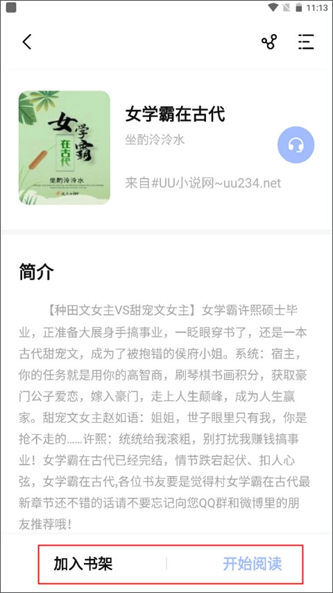 3、进入小说详情页面,查看小说简介后,你能够选择加入书架或者开始阅读。