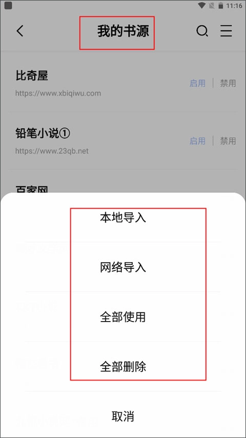 6、除了对书籍开展书架管理,你还能够启用或禁用书源,依据自身需求操作就行。