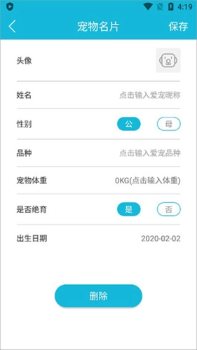 3、填写宠物相关信息并上传头像,完成后点击保存。