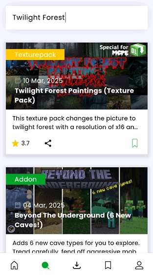 1、玩家可借助MCPEDL软件的搜索功能,直接输入模组名称搜索,比如输入暮色森林模组的英文名称Twilight Forest进行搜索。