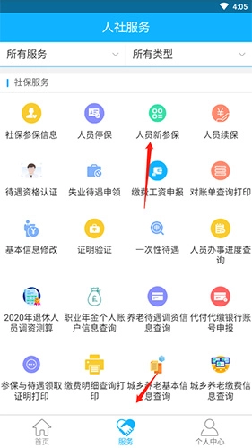 1. 开启软件,轻点底部的“服务”选项,接着点击“人员新参保”选项。