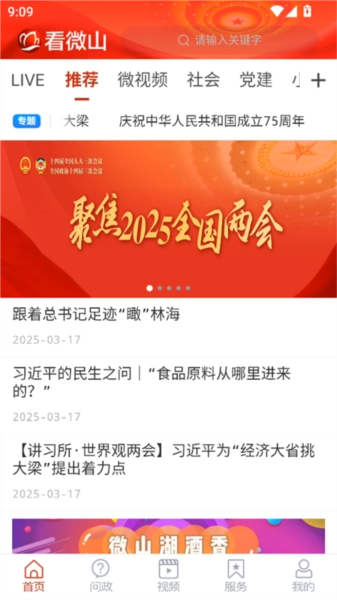 1. 在软件的首页,映入眼帘的是布局合理的主界面,其上分布着推荐、微视频、社会、党建等一系列板块。