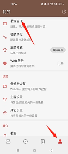 1首先打开软件,接着在软件底端找到并点击“我的”选项,随后再点击“书源管理”选项。