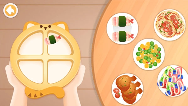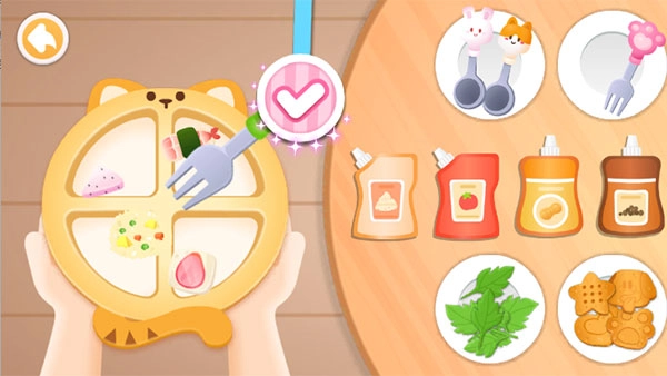 开始啦,宝宝选一个自己喜欢的餐盘。要吃什么主食,是菠萝饭、番茄意面还是三明治?到了选肉蛋的环节,哇,烤鸭腿看着真美味,就它了!再来一份水果拼盘和蔬菜,完成!