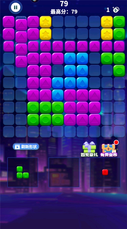 类似于俄罗斯方块玩法,选择下方的方块放置在上方,当完成一条全部颜色的方块即可进行消除