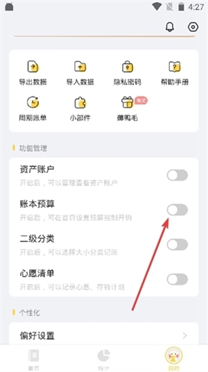 2. 在我的界面中寻找到【账本预算】功能,接着点击按钮予以开启。