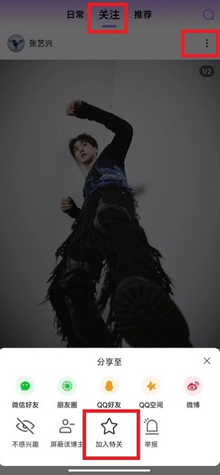方法一:在首页的“关注”标签页面,点击帖子右上角的“三个点”图标,接着点击“加入特关”。
