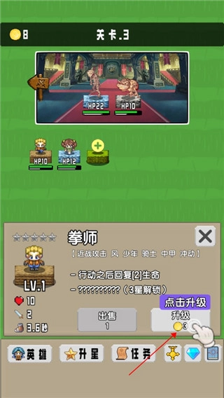 3、当有多余的资源时可以对勇者进行升级,每次世界都可以大幅度提升属性能力。