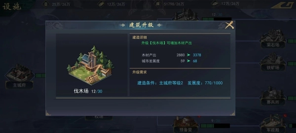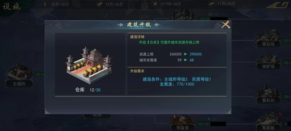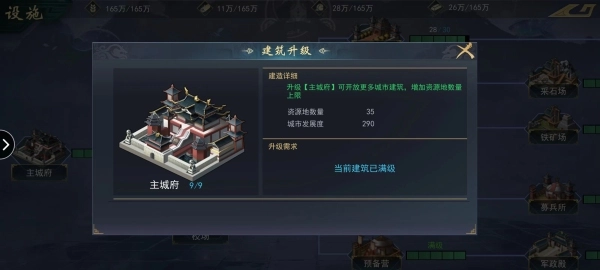 第二,是对主城府进行升级。主城府升级后,能够开放更多的城市建筑,并且提高资源地数目的上限,如此一来,玩家在攻占资源地时便不会受到限制。
