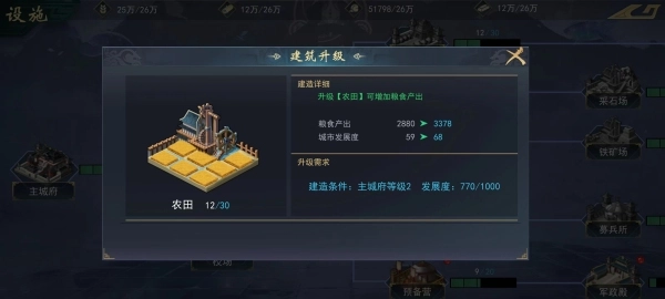若玩家期望迅速提升发展度,唯有依赖建筑的升级。游戏里,除主城府之外,建筑总体分为两类:一类是资源建筑,另一类为军事建筑。军事类建筑又细分为属性设施、城防设施、兵力设施,以及天策府与辎(此处原文本“锱”疑为“辎”之误,按正确表述修改)重营这两个独立建筑。