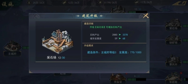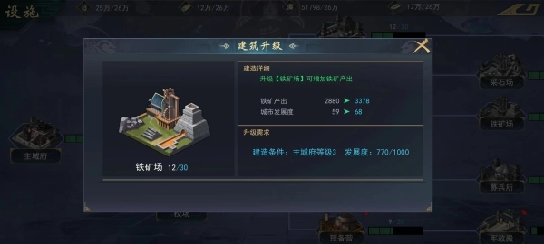第三,需对农田、伐木场、铁矿场、采石场等建筑进行升级。这四类建筑能够分别增加粮食、木材、石料以及铁矿的产出,从而进一步获取更多资源。这不仅是除攻占资源地之外获取资源的又一途径,还能为后续建筑升级提供资源支持。