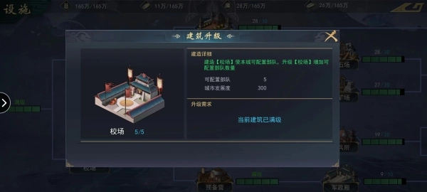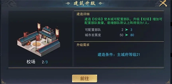 在军事建筑方面,玩家第一步需升级校场。校场能够让玩家进行部队配置,提升玩家出征的部队数量,进而执行更多指令。