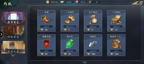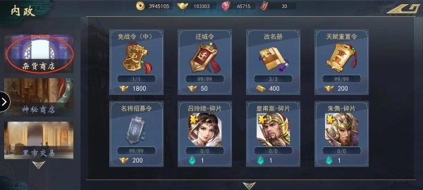 在主城府内,同样设有市集。市集里包含杂货商店、神秘商店、黑市交易以及积分商店。杂货商店中陈列着武将碎片、武器以及各类令牌等等,玩家能够使用元宝与铜币来进行购买。