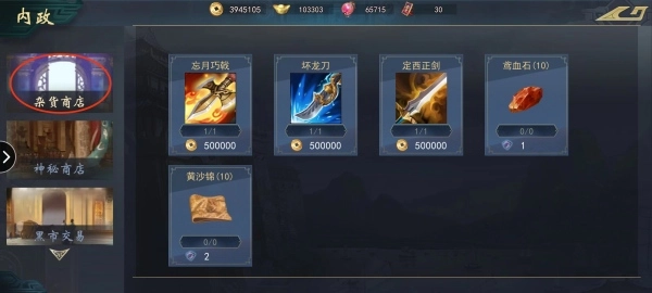 神秘商店中备有资源以及用于锻造武将装备的材料,只需花费元宝便可购得。