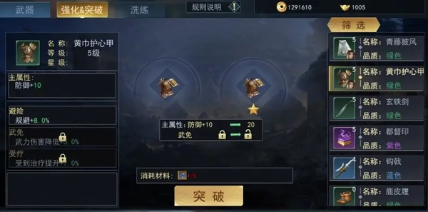 装备能够借助消耗【昆吾石】,来提高装备主属性的属性数值。每次突破装备,装备便增加1星,与此同时解锁一条全新的词条。
