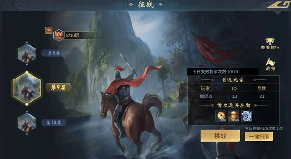 主公每成功挑战1层,就能获取首次通关奖励,若挑战失败则需重新挑战。每当达到3层或者4层的时候,可领取一份征战层数奖励。