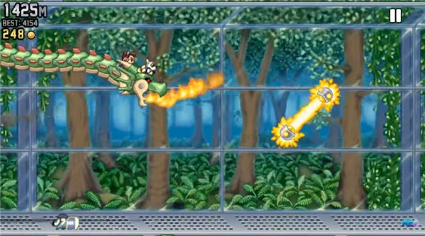 在疯狂喷气机这款游戏里,游戏人物始终保持向前飞行的状态,玩家无法操控人物的前进与后退,仅能控制其上下方向。在人物持续奔跑的过程中,还得躲避导弹、激光器以及电激光链。一旦被上述三种武器碰到,游戏随即结束。此外,游戏中会出现诸多有益的道具,像飞鸟、喷火龙、机甲之类。