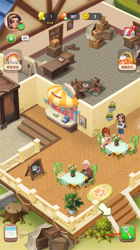 2、依据上方顾客的需求,合成对应的食物,完成右上角的任务后,便可开展装修工作。