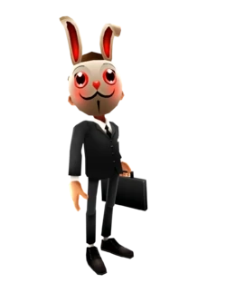 那兔子面具严严实实地遮住了脸庞,身着黑色西装、手拎公文包的上班族模样,成功掩饰了其技术黑客的真实身份。