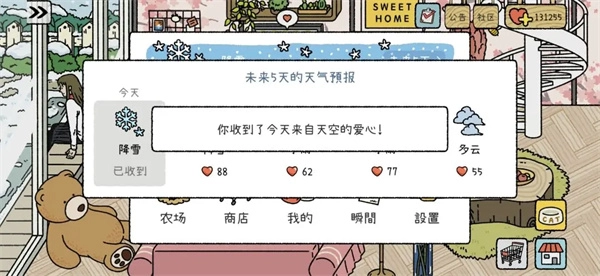 每天登录就能获得天气预报赠送的东西。你点击右下角的小房子图标,顶端会有个天气图标,点击它就行,只要每天登录,它都会送你。
