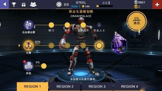 点击地图,其中包含三个大的分类,分别为自由搏击、比赛以及获取(氪金玩家必备),其难度呈逐渐上升趋势。自由搏击的主要作用是帮助玩家熟悉游戏操作,使玩家能够尽快上手。