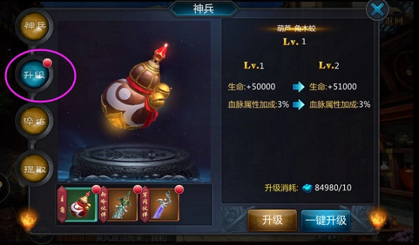 2、神兵升级:此操作旨在提升神兵的属性,使其达到更高水平。需特别留意,神兵每达到30级便可进行一次升级。