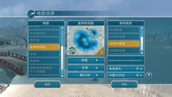 攒足2000购置重型鱼竿,接着前往皇帝的花园(此处有狗鱼、鲑鱼)。游戏类型仅选平衡型,其余条件照旧,尽量在深水区域钓大鱼。在这张地图,通常10分钟就能稳稳拿到第一名获得800收益,运气欠佳也能得第二名收获550。你会留意到电脑钓到不少鱼,然而重量却不高(因此不要选择比数量,锦标赛这个地方很坑,耗费时间长且收入不稳定,建议经验丰富的老手再去尝试)。