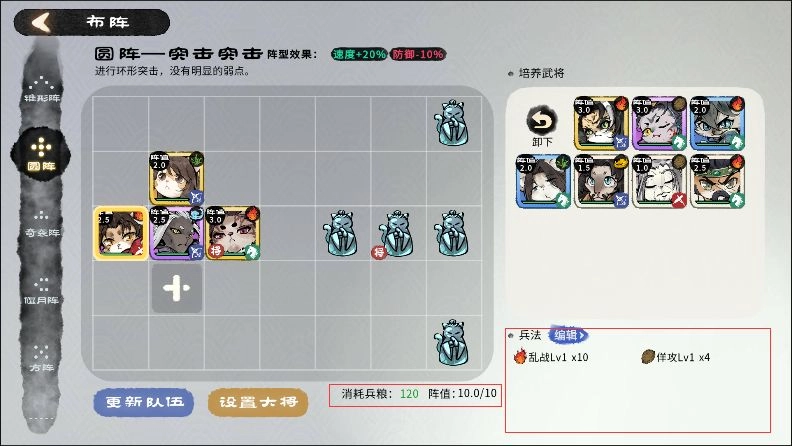 3. 阵值:指上阵武将所需的花费。在进行组队操作时,需将总阵值合计控制在10以内。