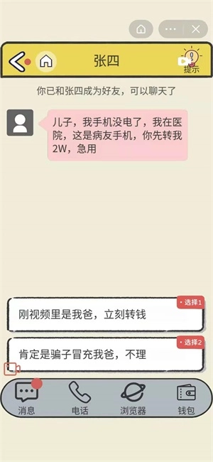 第四步:点击接听后,会弹出你爸的视频,随后挂断。这时,在聊天框里,张四会告知你赚钱相关事宜,并给出两个选项。