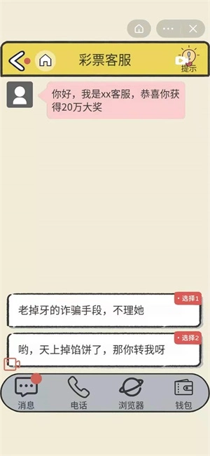 玩家在游戏中以手机聊天形式进行关卡挑战,每一关的诈骗案例都独具特点,骗子的套路也是花样百出。这就要求玩家在游戏过程中,对每一个选择都要慎之又慎,稍有不慎,便会落入对方精心设计的圈套,导致闯关失败。