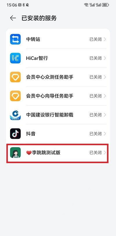 4、在此页面中,可以看到有李跳跳这个软件,右边显示的是【已关闭】按钮,点击进入功能设置界面去打开;
